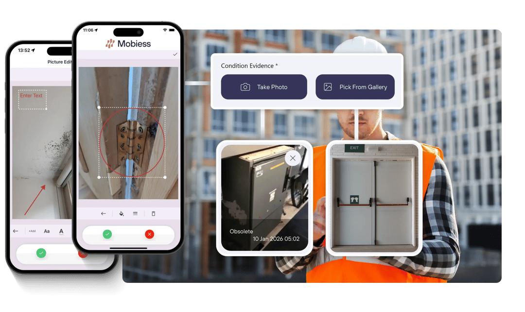 All captured images and annotations flow directly into Mobiess reporting. Evidence is automatically linked to asset condition summaries, defects, actions and compliance reports.