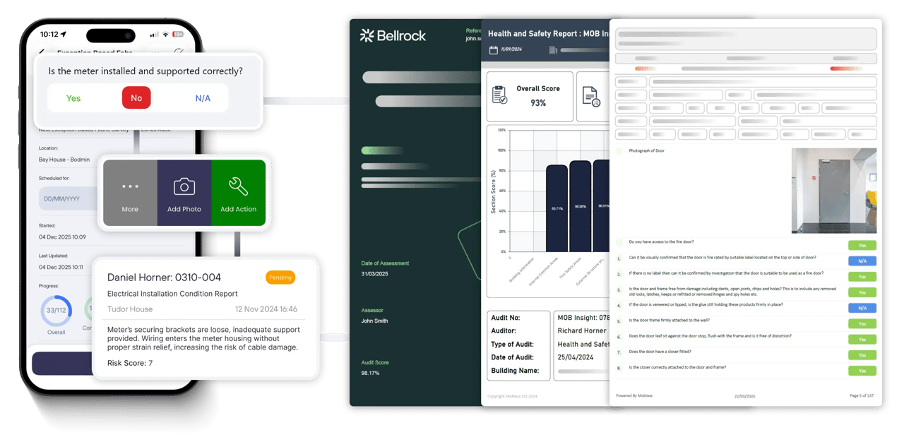 Bellrock digitised safety audits with Mobiess, cutting inspection time by 50%, removing paper, and gaining real-time compliance insight across estates.